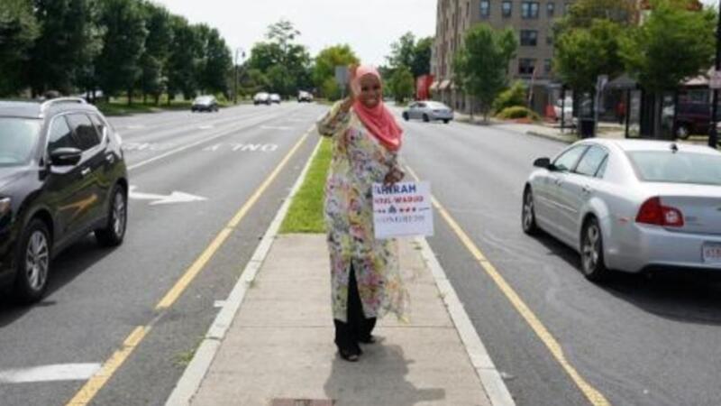 تقف امرأة ترتدي حجابا زهري اللون في مشهد غير مألوف وسط طريق في ماساتشوستس لتلوح للسيارات القادمة طالبة من غرباء التصويت لها لدخول الكونغرس.