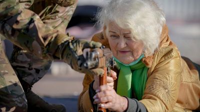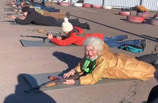 وقالت الجدة الأوكرانية فالنتينا كونستانتينوفسكا، التي ظهرت تحمل السلاح على الأرض، تتدرب على الدفاع ضد هجوم روسي محتمل، «والدتك ستفعلها أيضًا».
