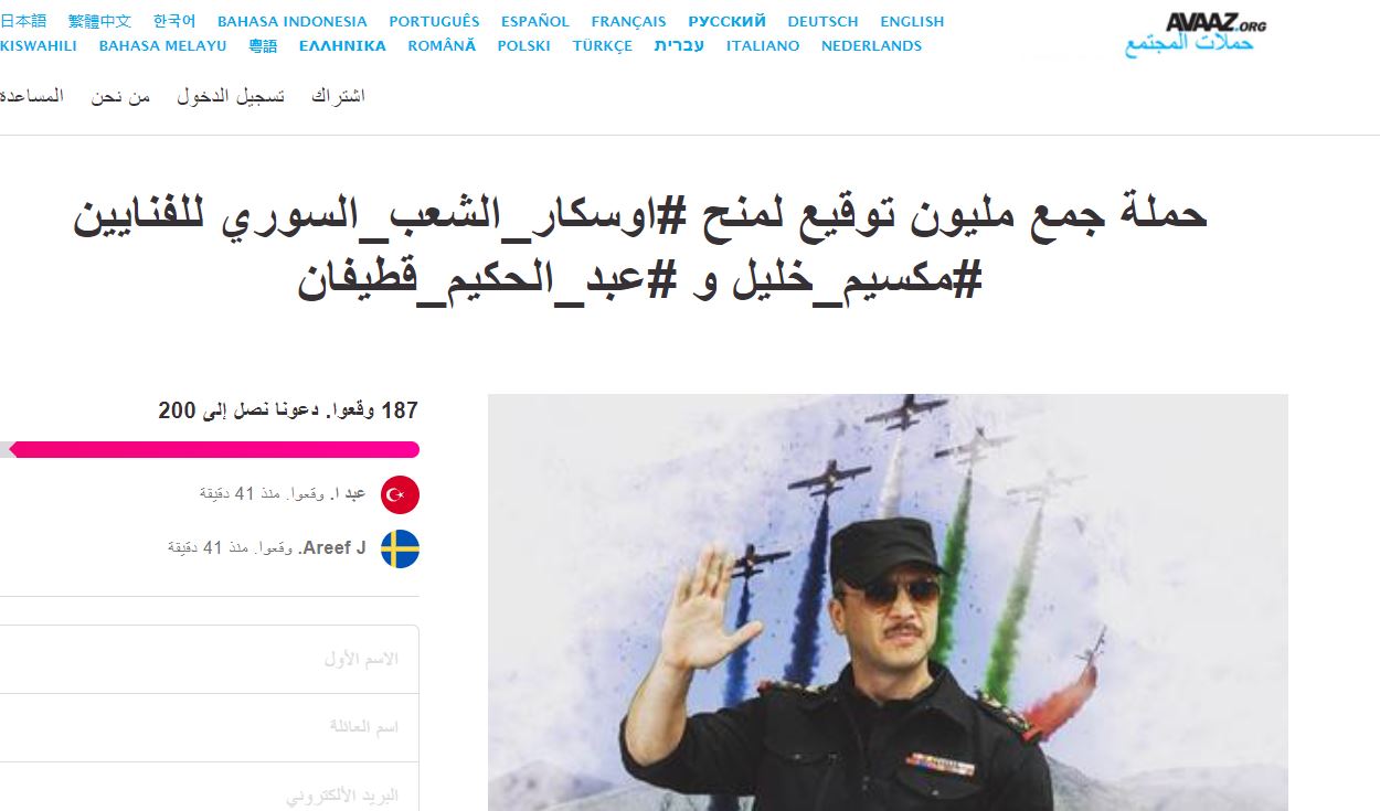 بدا ناشطون على موقع حملات المجتمع افاز Avaaz.org  لجمع مليون توقيع في اطار حملة لمنح جائزة الاوسكار الى الفنان السوري المعارض مكسيم خليل وزميله عبدالحكيم قطيفان