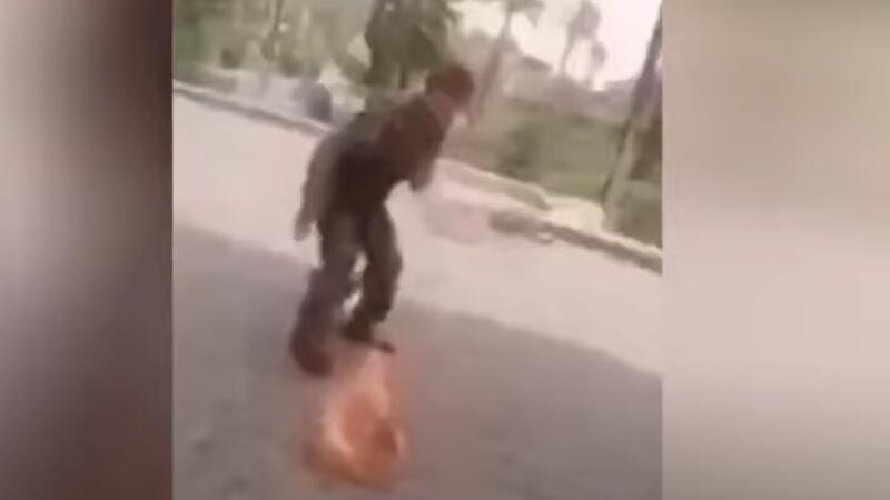 اظهر تسجيل فيديو متداول على الانترنت الاحد، ما يبدو انه عسكري عراقي وهو يحاول اضرام النار في نفسه في ساحة الحرية وسط العاصمة بغداد، قبل ان يتدخل عدد من الاشخاص ويمنعونه من اتمام المحاولة.