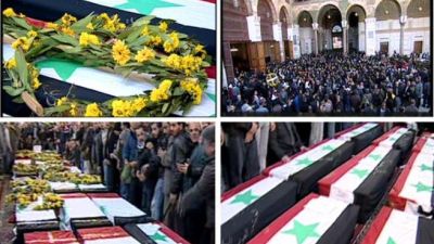 شيعت حشود كبيرة من السوريين يقدر عددها بعشرات الآلاف في الجامع الأموي ظهر السبت بموكب رسمي وشعبي شهداء العملين الإرهابيين اللذين وقعا الجمعة بدمشق وأديا إلى استشهاد 44 وجرح 166 من المدنيين والعسكريين.