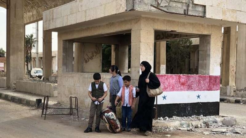 امرأة وأطفالها قرب معبر نصيب على الحدود مع الأردن