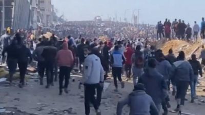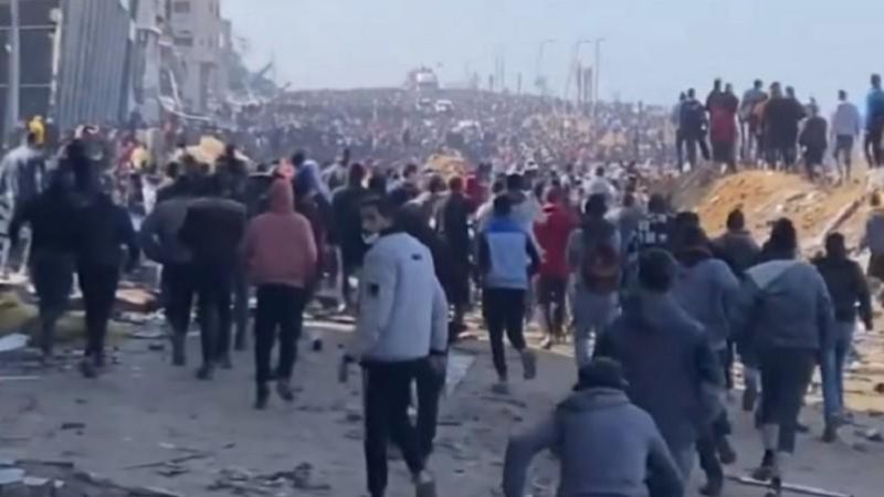 وقصف جيش الاحتلال الإسرائيلي بالقذائف المدفعية عشرات الفلسطينيين الذين كانوا ينتظرون شاحنات المساعدات عند دوار الكويت في حي الزيتون جنوب شرقي مدينة غزة.