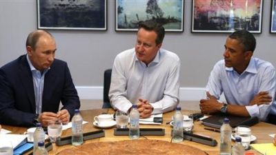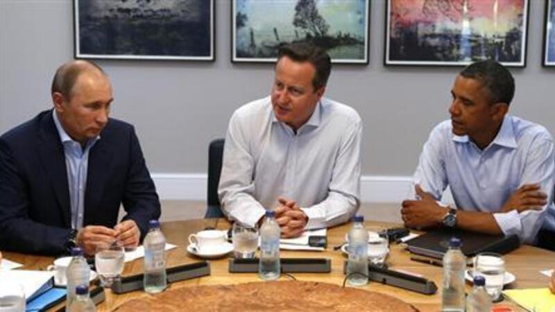 الرئيس الامريكي باراك أوباما ورئيس الوزراء البريطاني ديفيد كاميرون والرئيس الروسي فلاديمير بوتين في اجتماع ضمن قمة مجموعة الثماني في ايرلندا