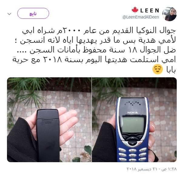 وذكرت لين الصفطاوي في تغريدة نشرتها بموقع "تويتر" أن "جوال النوكيا القديم من عام 2000 شراه أبي لأمي هدية، بس ما قدر يهديها إياه لأنه انسجن"، مضيفة أن الجوال بقي 18 سنة محفوظا بأمانات السجن (..)".