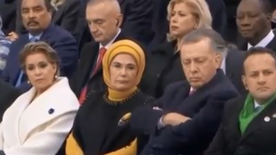 فخلال كلمة للرئيس الفرنسي، إيمانويل ماكرون، أمام زعماء العالم في باريس بمناسبة مئوية انتهاء الحرب العظمى، رصدت الكاميرا أردوغان وهو يغط في النوم.