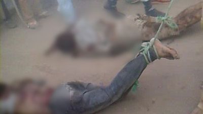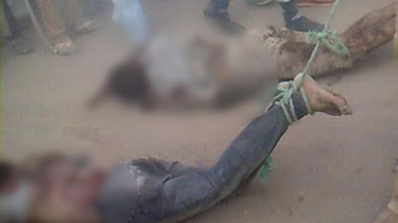 وبعد ذلك قام الاهالي بتعليق الجثتين على اعمدة انارة في احد الشوارع.