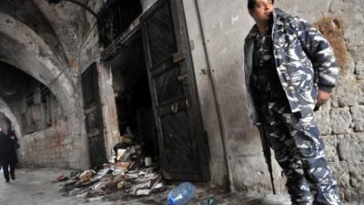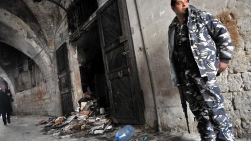 رجل امن امام مكتبة السائح التي تم احراقها في طرابلس