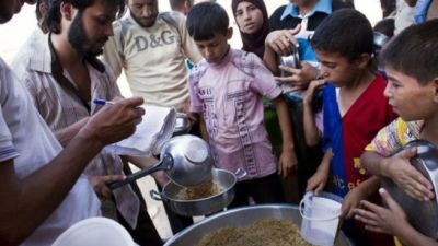 نازحون سوريون يستلمون وجبات غذائية قرب معبر السلامة عند الحدود التركية السورية