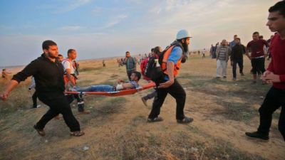 وذكر البيان أن قحمان أصيب بعيار ناري في رقبته شرقي مدينة رفح (جنوب). وأضاف أن 36 متظاهرا أصيبوا برصاص الجيش الإسرائيلي، بينهم 6 أطفال و9 نساء.
