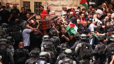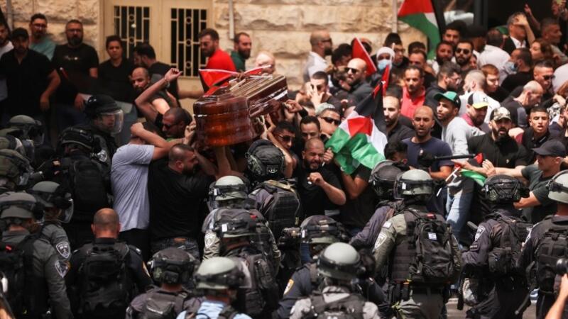 وفي وقت سابق الجمعة، هاجمت الشرطة الإسرائيلية، فلسطينيين بعد شروعهم في تشييع جثمان الصحافية أبو عاقلة بالقدس الشرقية.