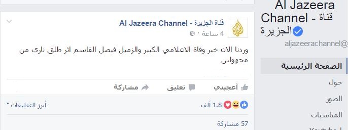 نشرت مواقع اخبارية عربية خبرا قالت انه ورد على الصفحة الرسمية لقناة الجزيرة ويفيد بمقتل الاعلامي فيصل القاسم بطلق ناري في قطر.