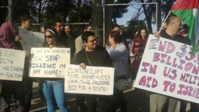 بالتوازي فقد احتج المئات من ابناء الضفة على الزيارة وساروا باتجاه المقاطعة حيث مقر الاجتماع رافعين اللافتات الداعية لطردها من فلسطين