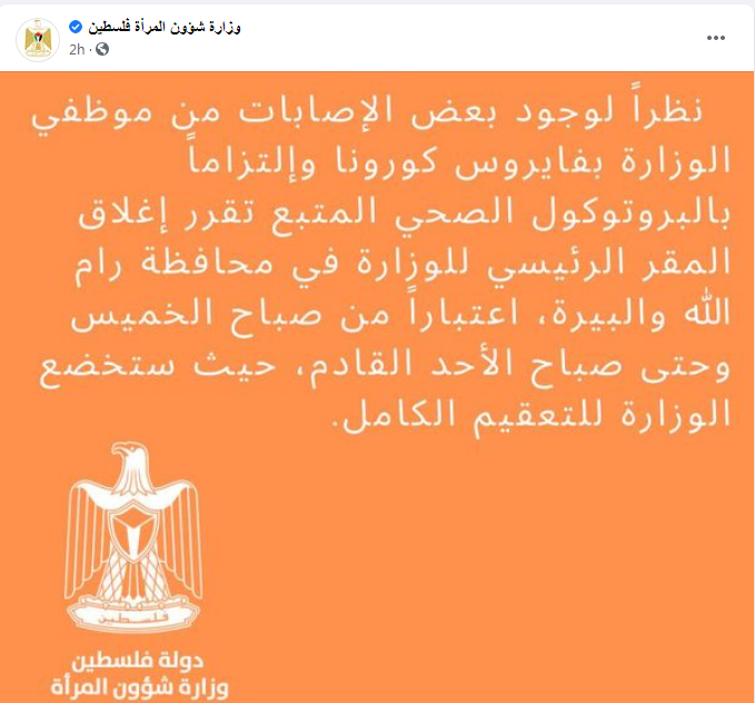 كما قررت وزارة شؤون المرأة، إغلاق المقر الرئيسي للوزارة في محافظة رام الله والبيرة، اعتبارا من صباح الخميس وحتى صباح الأحد، حيث ستخضع الوزارة للتعقيم الكامل نظرا لوجود بعض الإصابات من موظفي الوزارة بفيروس كورونا.