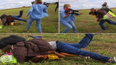 لحظة عرقلة اللاجىء السوري وطفله من قبل المصورة التلفزيونية المجرية