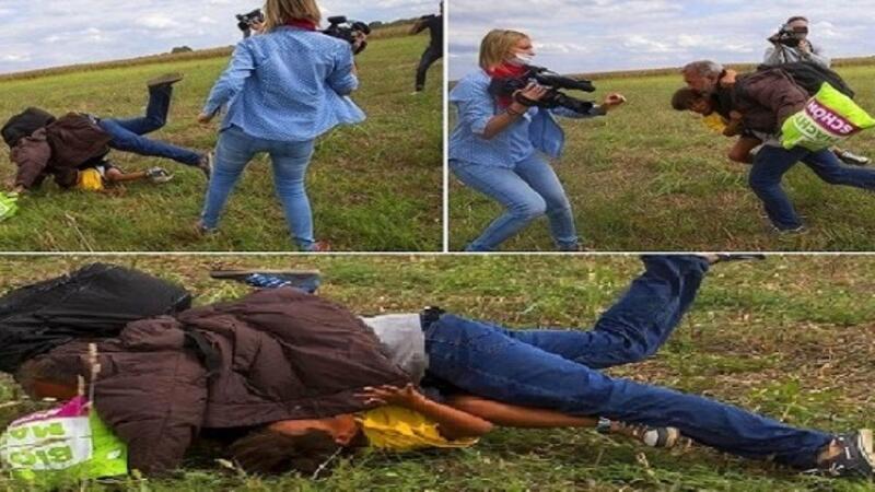 وتظهر في اللقطات مصورة كانت تعمل لدى قناة تلفزيونية خاصة في المجر وهي تمد ساقها لدى مرور الرجل لعرقلته. وفصلت القناة المصورة بسبب الواقعة.