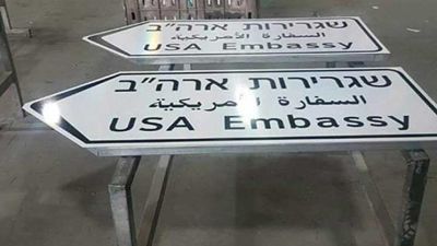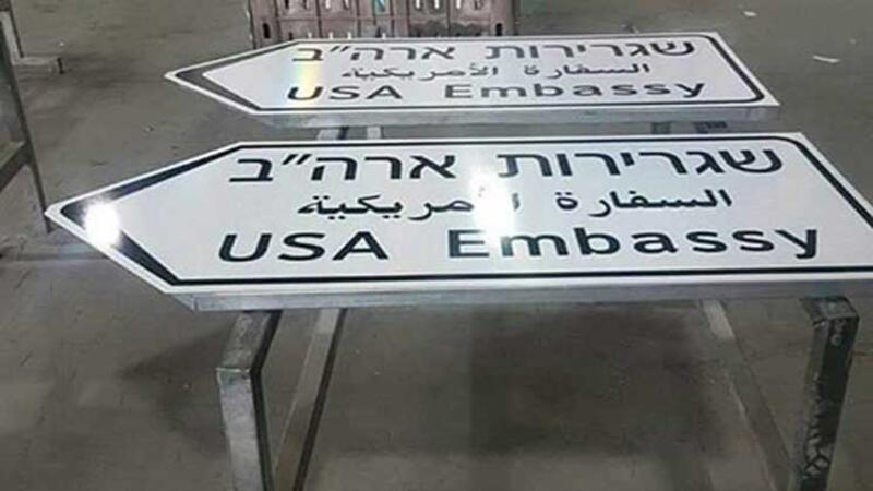 وظهرت ثلاث لافتات طريق على الأقل مكتوب عليها “السفارة الأمريكية” في القدس المحتلة الاثنين قبل افتتاح السفارة الأسبوع المقبل في المدينة.