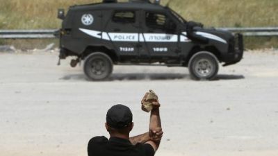 متظاهر فلسطيني يحمل حجارة في مواجهة دورية اسرائيلية