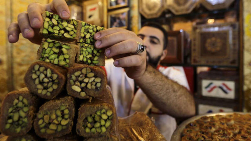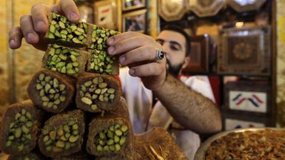 ويحمل أبومعتز قطعة بقلاوة طازجة ويشرح بفخر “قطعة الحلوى هذه تتكوّن من مواد تأتي من كل المدن، الفستق من حماة (وسط)، والسمن من دير الزور والرقّة (شرق)، والطحين من حوران (جنوب). كلّها مكوّنات سوريّة مئة بالمئة”.