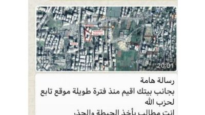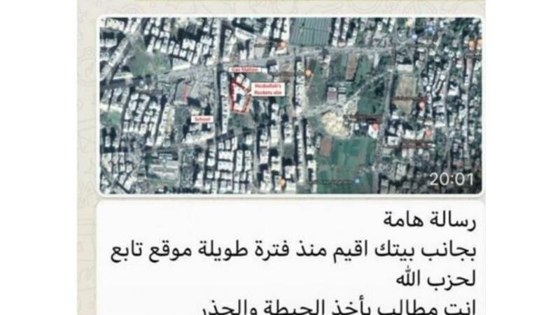 وتحث الرسالة على اتخاذ الحيطة والحذر، مرفقة بصورة لمنطقة سكنه مع إشارة إلى مراكز حزب الله.