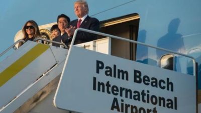 وصول الرئيس دونالد ترامب وزوجته ميلانيا مع رئيس الوزراء الياباني شينزو آبي وزوجته آكي على متن الطائرة الرئاسية الى مطار بالم بيتش الدولي بولاية فلوريدا