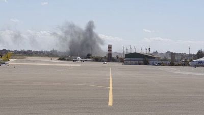 تتعرض مواقع داخل مطار معيتيقة في العاصمة الليبية طرابلس منذ الصباح الباكر لقصف عنيف بالمدفعية الصاروخية، فيما تتصاعد أدخنة سوداء فوق المكان.