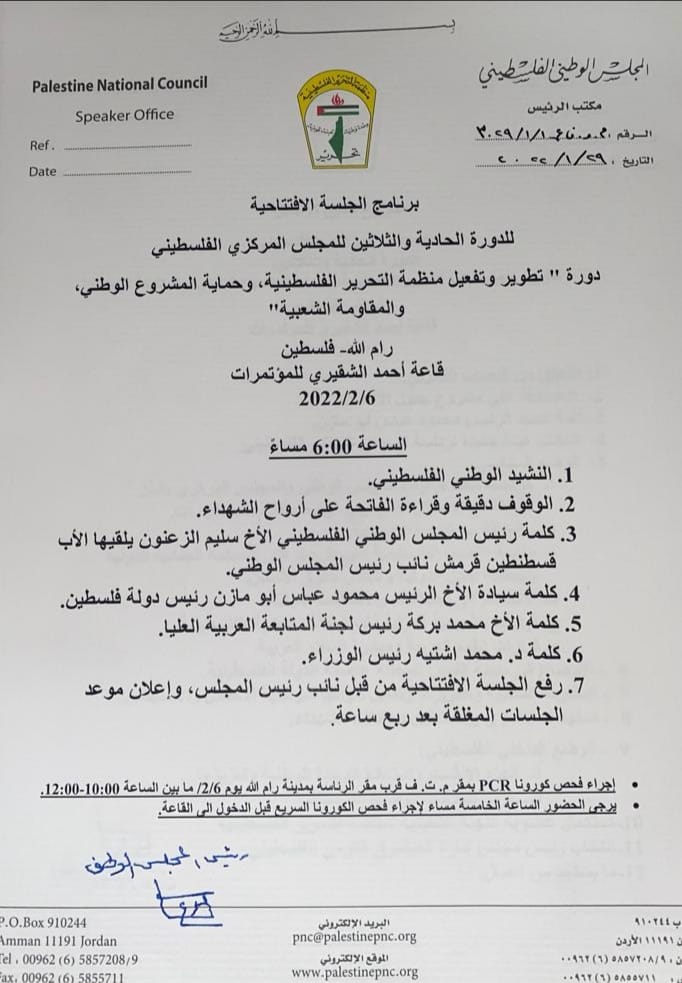 - المجلس الوطني وفي دورته الاخيرة التي عقدت قبل 3 سنوات فوض المجلس المركزي لمنظمة التحرير الفلسطينية ليقوم بمهام المجلس الوطني فالذي سيعقد هو المجلس المركزي للمنظمة وليس المجلس الوطني ولقد تقرر عقده يوم الاحد القادم في رام الله