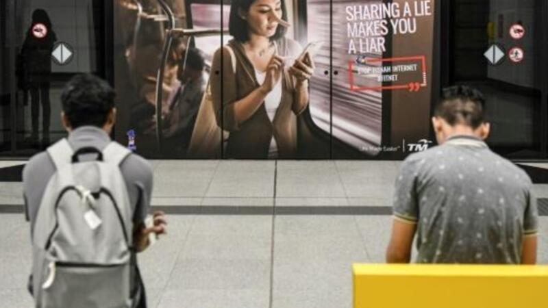 ملصق اعلاني يقول "مشاركة كذبة يجعلك كاذبا" في كوالالمبور في اطار مكافحة الحكومة الماليزية للأخبار المضللة