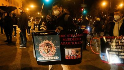 ورفع المتظاهرون لافتات كتب عليها رسائل مثل “العدالة لآدم توليدو” و “أوقفوا إرهاب الشرطة العنصري!” في مسيرة سادها الهدوء مع حلول الليل.