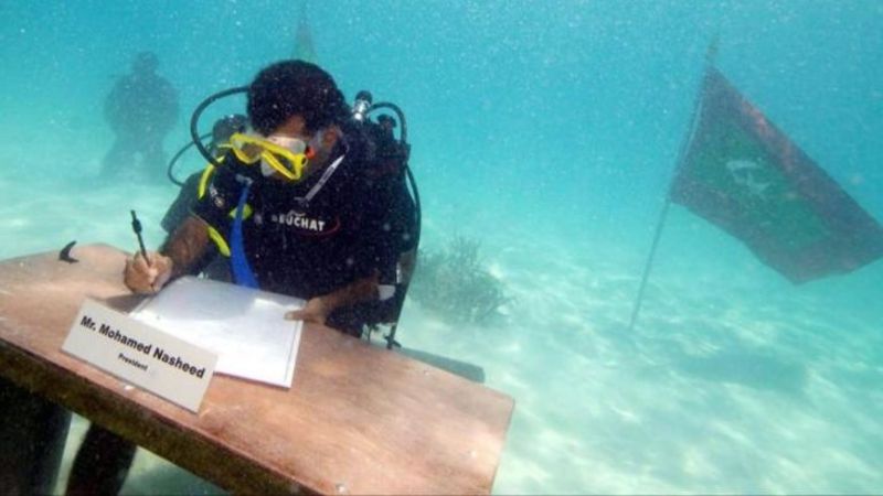 في مشهد أصبح أيقونياً عالمياً، عقدت حكومة المالديف عام 2009 اجتماعاً رسمياً تحت مياه المحيط على عمق يقارب 4 أمتار، في رسالة رمزية للتحذير من مخاطر ارتفاع منسوب البحار الذي يهدد وجود الأرخبيل.