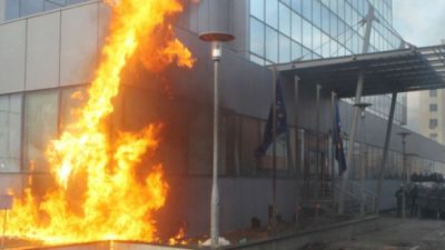 واندلع حريق في مقر الحكومة بالعاصمة بريشتينا بعد أن ألقيت عليه قنابل حارقة وتمكن رجال الإطفاء من إخماد الحريق سريعا واستخدمت الشرطة الغاز المسيل للدموع لتفريق آلاف المحتجين المعارضين.