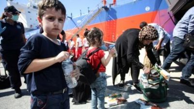 مهاجرين يحصلون على ماءوغذاء عند وصولهم الى مرفأ هيراكليون في جزيرة كريت اليونانية