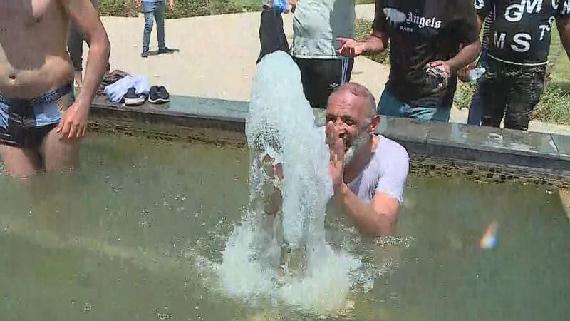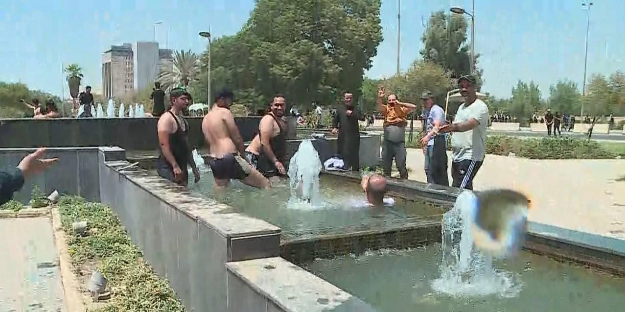قام عدد من أنصار التيار الصدري، الذين اقتحموا مبنى البرلمان العراقي في المنطقة الخضراء وسط العاصمة العراقية بغداد، اليوم السبت، بالاستحمام في نافورة المبنى، وسط صدامات بين المتظاهرين وقوات مكافحة الشغب.