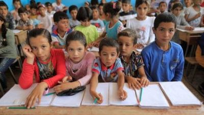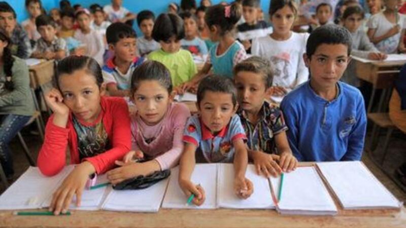 أطفال يحضرون حصتهم الأولى بعد تسجيلهم مباشرة في مدرسة في حزيمة بشمال الرقة بسوريا