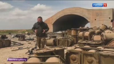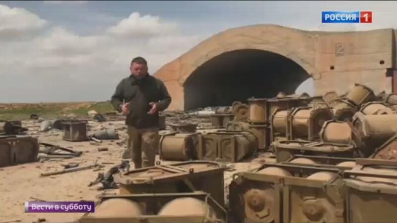 وقد تنقل المراسل الحربي للقناة، يفغيني بودوبني، في مطار الشعيرات، بعد أن قصفته البحرية الأمريكية بصواريخ مجنحة، وكشف المراسل حقيقة الحاويات التي يتم استخدامها للذخائر الحربية لسلاح الجو حتى إن بعضها بدى قديما ومتهالكا، ولا يمكن أن يكون وعاء لأي سائل.