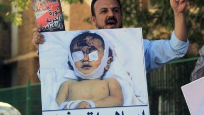 متظاهر يرفع صورة طفل قتلته القوات السورية خلال تظاهرة قام بها سوريون وسودانيون في الخرطوم للتنديد بالقمع في سوريا
