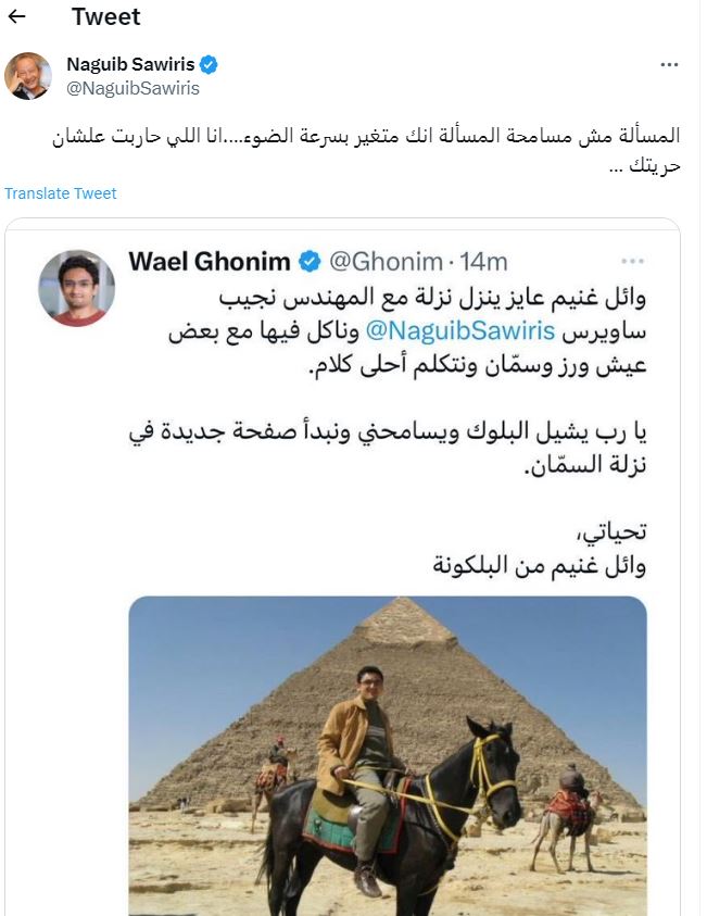 وقال غنيم وهو احد رموز الثورة المصرية التي اطاحت بالرئيس المصري الاسبق محمد حسني مبارك ان ساويرس سامحه ورفع الحظر عن حسابه على منصة "تويتر"، بعد أن طلب الأول منه ذلك في وقت سابق، ورد عليه ساويرس عاتبا ومذكرا بأنه "حارب من أجل حريته".