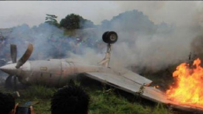 وقالت قناة "بي إن جي" إن الطائرة عرض لها عطب في المحرك على ما يبدو فهوت وتحطمت بعد ظهر الأربعاء في مستنقع قرب مهبط المطار.