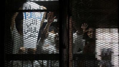 المصور المصري محمود ابو زيد (يمينا) مع صحفيين آخرين اثناء احدى جلسات محاكمتهم