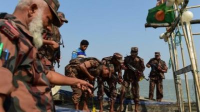 حرس الحدود البنغلاديشيين يفتشون قارب صيد أثناء قيامهم بدوريتهم على طول نهر ناف في تكناف على طول الحدود بين ميانمار وبنغلادش.