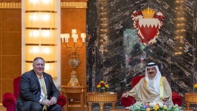 وقال بومبيو في تغريدة على حسابه على "تويتر" إنه ناقش مع ملك البحرين وولي العهد الأمير سلمان بن حمد آل خليفة "أهمية بناء السلام والاستقرار الإقليميين، بما في ذلك أهمية وحدة الخليج ومواجهة النفوذ الإيراني الخبيث في المنطقة".