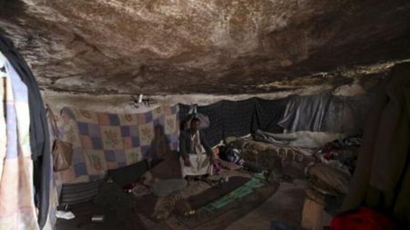 نازحون يمنيون في كهف في منطقة خمير في محافظة عمران