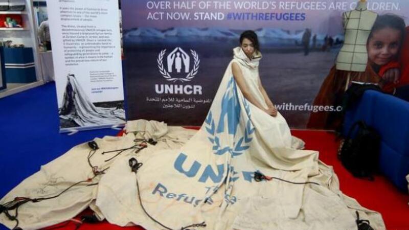 أثار ثوب صنع من قماش خيمة للاجئين السوريين ضجة كبيرة في دبي. ويظهر على الثوب الطويل الشعار الأزرق للمفوضية السامية للأمم المتحدة لشؤون اللاجئين، وآثار الحياة اليومية، كتابات وبقع سوداء، التي يعيشها اللاجئون في مخيم الزعتري، وهو واحد من أكبر مخيمات اللاجئين في العالم، إذ يضم حوالي 80 ألف لاجئا سورية. ويتم عرض هذا الرداء في مؤتمر يحمل عنوان "الإغاثة والتطوير" في دبي. ومن المفترض أن يكون هذا الرداء أداة تذكير زوار المعرض بالحرب في سورية ولفت انتباهم إلى المعاناة التي يعيشها الناس هناك.