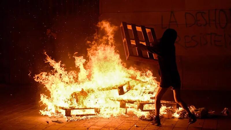 متظاهرون يضرمون النار في احد شوارع برشلونة