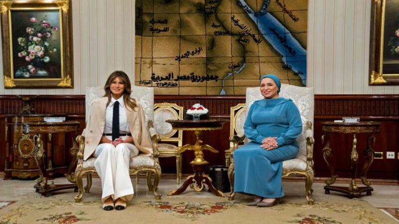 وكانت زوجة الرئيس المصري انتصار السيسي في استقبال نظيرتها الأمريكية بالمطار، في بداية الزيارة التي ستشمل منطقة الأهرام في محافظة الجيزة المجاورة للقاهرة.