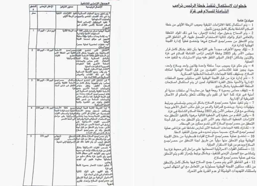 ويبدأ المسار الزمني للخطة بوقف شامل للعمليات العسكرية، يترافق مع إجراءات إنسانية عاجلة من جانب الاحتلال الإسرائيلي، مقابل التزام حركة حماس بوقف أنشطتها العسكرية، وتمكين اللجنة الوطنية من مباشرة مهامها داخل القطاع، بما يمهد لتهيئة الأرضية السياسية والميدانية للانتقال إلى المراحل التالية.