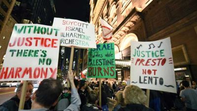 وحمل المحتجون لافتات كتبوا عليها عبارات رافضة لوجود الأوركسترا، من قبيل “قاطعوا الأوركسترا الفيلارمونية الإسرائيلية”، و”بدون عدالة لن يكون هناك فيلارموني”.