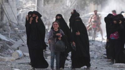 نساء تم اجلاؤهن بواسطة قوات سوريا الديمقراطية من منطقة كانت خاضعة لتنظيم الدولة الاسلامية