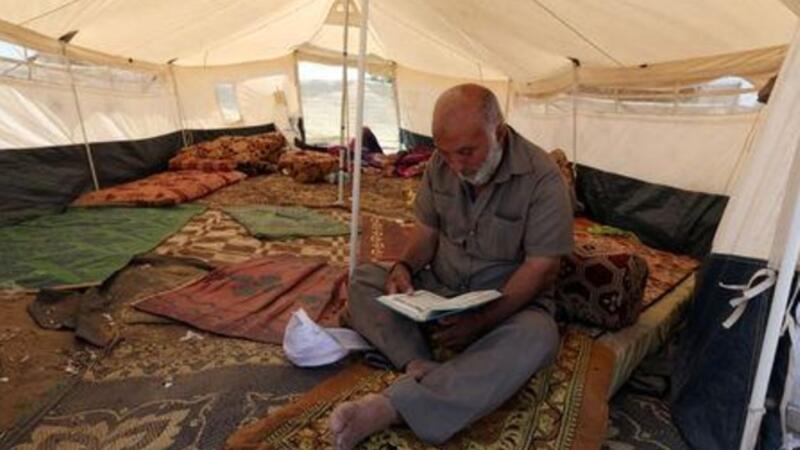 رجل فلسطيني يقرأ القرآن داخل خيمة خلال شهر رمضان في مخيم احتجاج قرب حدود إسرائيل مع قطاع غزة