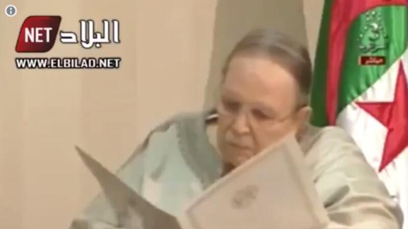 وبدا بوتفليقة منهكا صحيا، يرتدي قميصا أبيض، وجالسا على كرسي متحرك.